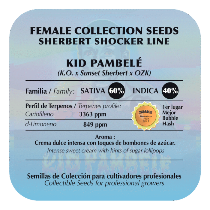 En honor a uno de los boxeadores colombianos más importantes, Antonio Cervantes, más conocido como Pambelé. La unión de nuestra selección de la poderosa K.O y nuestra selección de Sherbert Shocker del famoso Wizard of Obs, hacen de este cruce una maravilla. Plantas de floración rápida de 7-8 semanas, perfecta para SCROG y plantas madres ya que su estructura de arbusto permite un manejo agronómico fácil. Es excelente para época de verano y la reina de la extracción ¡No te pierdas esta joya que une a lo mejor de ambos mundos!