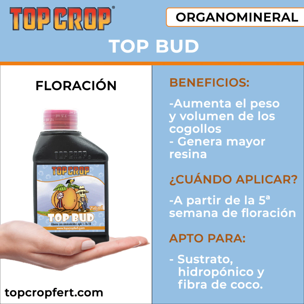 Top Bud ha sido diseñado específicamente para la fase final de la floración, afectando directamente al fruto obtenido. De composición órgano-mineral, éste producto creado por los expertos en nutrición vegetal de la marca Top Crop, ha marcado la diferencia respecto a otros nutrientes y aditivos de similar composición. La gran calidad que presenta, resultará efectiva, mejorando visiblemente la cantidad y calidad del cogollo.